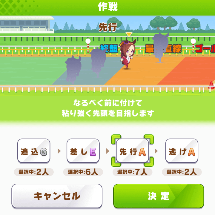 There are four strategies in total - from left to right, unofficially called Chaser, Betweener, Leader, and Runner. You should always use a strategy your character is good at, unless you know what you’re doing. Chaser stays in the back of the pack and pushes for victory in the final phase. Betweener is similar but doesn’t stay as far back. Leader tries to stay even further ahead and “leads” the main pack. Runner always pushes for first place and tries to win by getting a big lead on everyone else early.