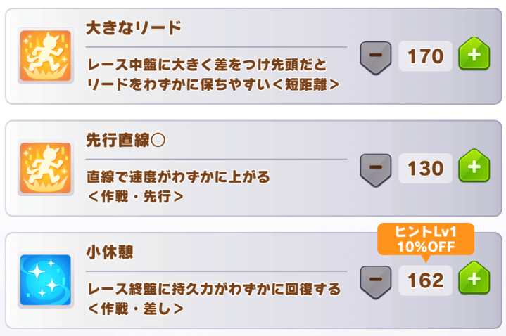 Speaking about skill points (スキルPt), as you probably already guessed, they are the currency to buy skills with. You can get them from training events, and, most commonly, from participating in races.