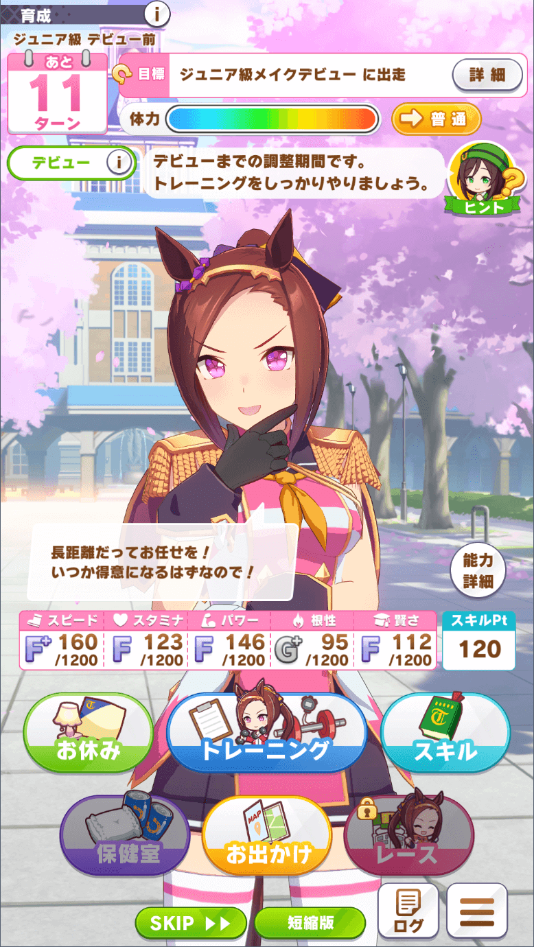 Before you can start training, you have to select a few things. The first one is your horse girl of choice, of course. If you’re completely lost and have no idea who to train first, maybe try Sakura Bakushin O. She’s widely considered to be the easiest character to train and gives you a lot of leeway while you’re figuring out what button does what.