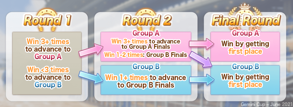 The races are held in an "all or nothing" fashion — the winning horse girl will get a victory for her trainer, the other two players will get a defeat.