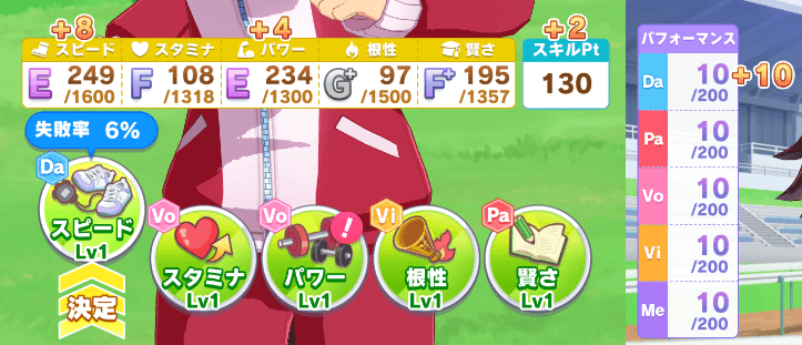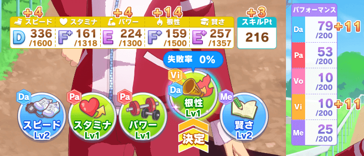 In Grand Live, apart from the basic stats (Speed, Stamina, Power, Guts, Wisdom), you will also gather a new set of performance tokens called Dance, Passion, Vocal, Visual, and Mental.