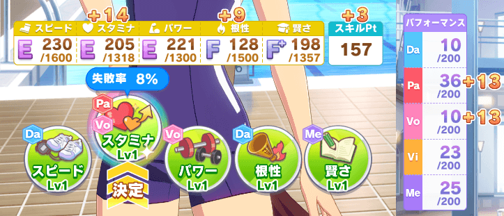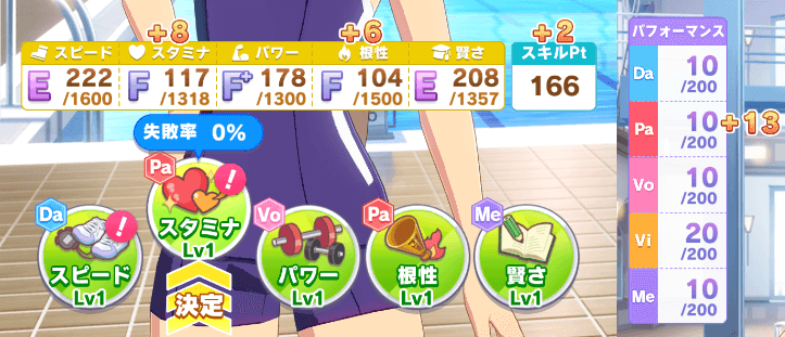 In addition to gaining Live Techniques or practicing songs, lessons can also have additional Practice Bonuses (習得ボーナス, two yellow up arrows) that will be awarded alongside the learned technique or practiced song when doing said lesson. These can range from stats (such as giving you 10 Speed) to skill hints or skill points.