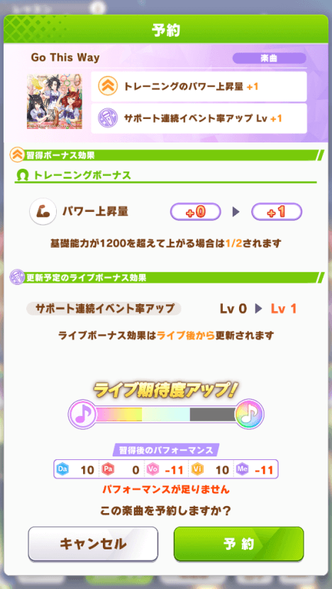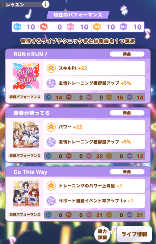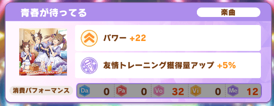 Aside from that, song lessons may also grant Live Bonuses (ライブボーナス, purple microphone below practice bonus), whose effects include, for example, increasing the likelihood of triggering support card chain events (サポート連続イベント率アップ).