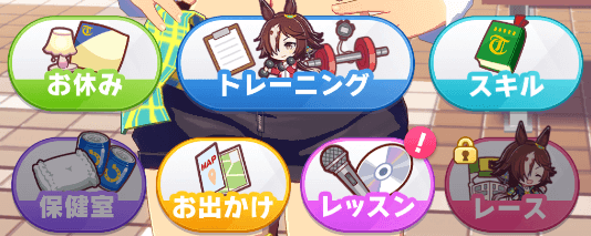 The button to access the lesson menu is located between the outing and race buttons of the home menu. It will be locked until the fifth turn of the training run, which is when the 「グランドライブ再建計画、開始!」training event happens, signaling the start of the Grand Live mechanics.