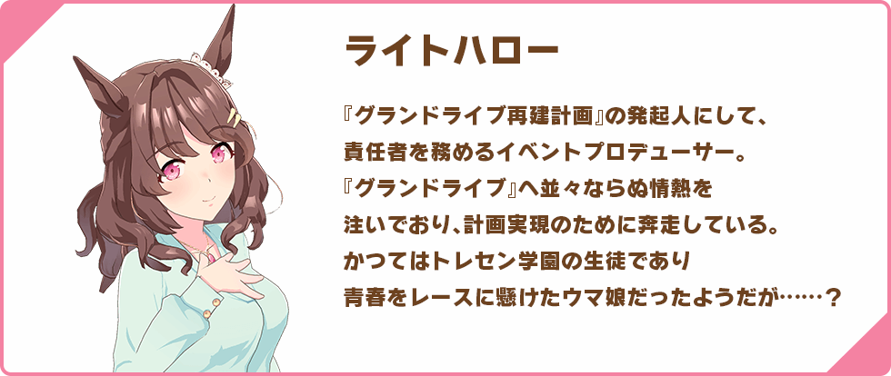 For this purpose, you will be joined by the scenario link characters, including Light Hello (ライトハロー). She is an event producer and a horse girl herself, voiced by Kana Ueda.