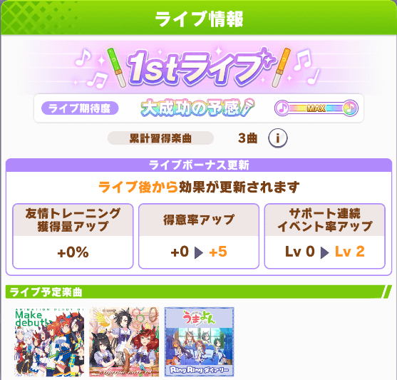 Live Bonuses will stay in effect for the entirety of the training run and have levels that can be raised by doing lessons with the same bonus. For example, doing a lesson with a Live Bonus which increases the probability of support card chain events triggering while already having this bonus on level 5 will raise its level to 6 (once the next Live happens).