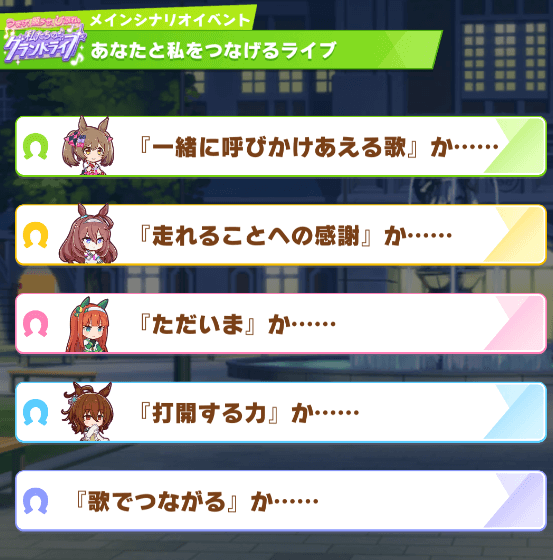 This scenario marks the return of the Scenario Link mechanic, featuring Silence Suzuka, Agnes Tachyon, Smart Falcon, Mihono Bourbon, and Light Hello, a new original NPC introduced in the story of Grand Live.