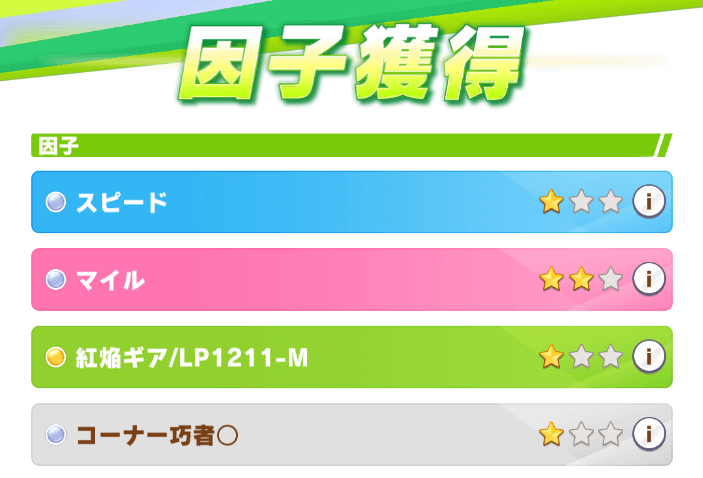 Green factors are a special type of genes that can grant characters access to their parents' unique skills. Unique skills are those with special animation and a rainbow background in the skill list (for example Maruzensky's LP1211-M).