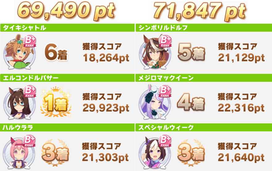 Overall, in this case, it was mostly Taiki Shuttle who really brought the team down, in more ways than one. Not only did she get a very low personal score, but she also finished just out of Top 5, and made the dirt team lose out on any kind of a team bonus.